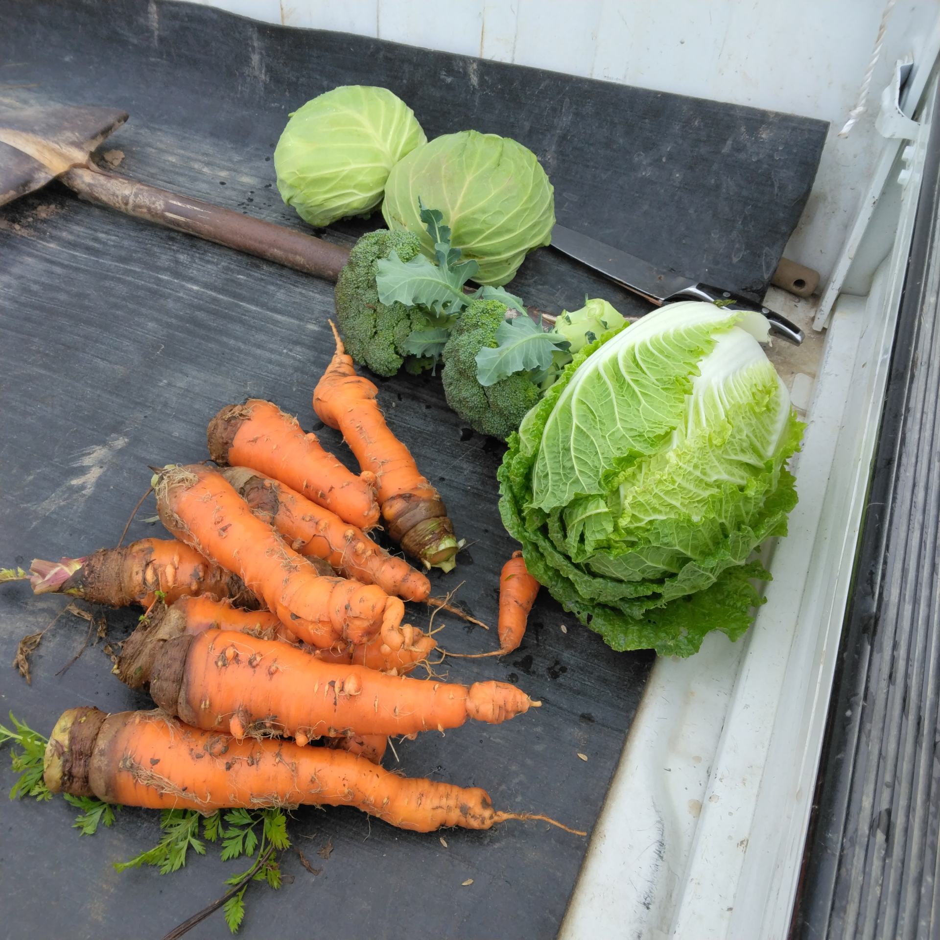 今日は、キャベツと白菜、ニンジン、ブロッコリーを収穫しました。白菜は大きくズッシリと重いです。
